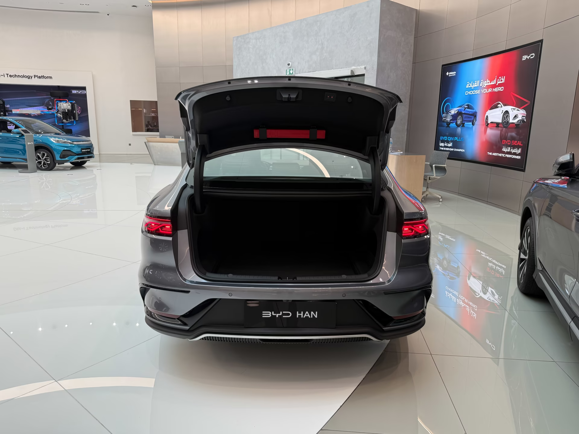 Phần đuôi xe của BYD Han được thiết kế theo cấu trúc đa tầng, tạo chiều sâu và sự cân đối. Cụm đèn hậu LED thanh mảnh lấy cảm hứng từ nanh vuốt sư tử đặt ngược, kết hợp với dải LED nối liền hai bên, mang lại vẻ sang trọng và hiện đại. Cốp sau được vuốt cong như cánh gió tích hợp, vừa tăng tính thẩm mỹ vừa cải thiện hiệu suất khí động học. Khu vực biển số kích thước lớn cùng đèn phản quang hai bên giúp hoàn thiện vẻ ngoài đầy cuốn hút của BYD Han.