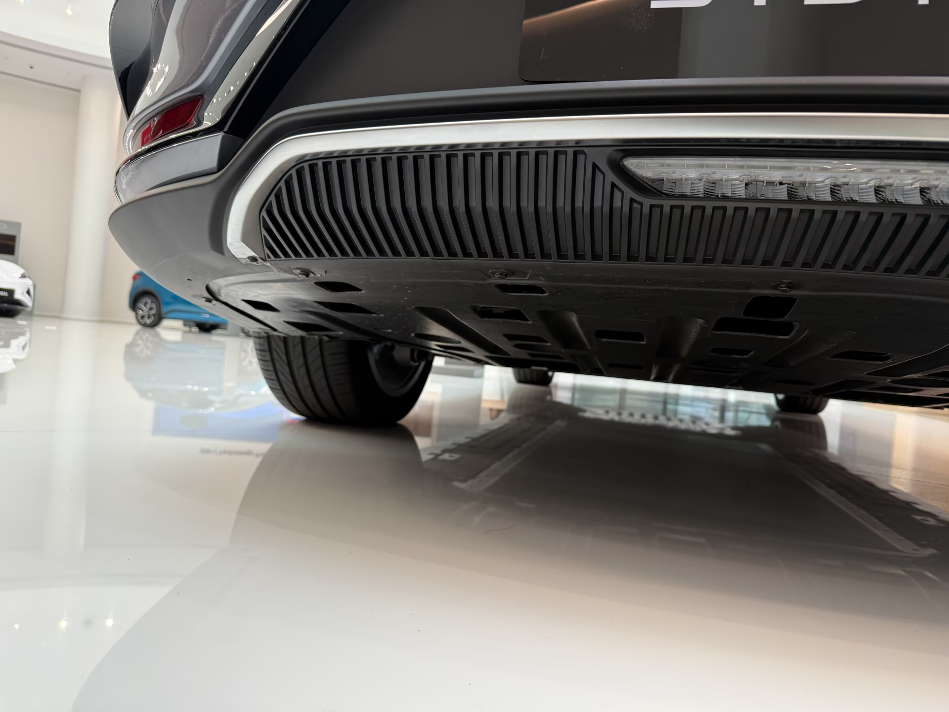 Xe không có lưới tản nhiệt truyền thống mà thay vào đó là hốc gió lớn kết hợp với dải nhựa bạc chạy ngang phần đầu, tích hợp logo BYD nổi bật. Khu vực khe gió trung tâm và cản trước được thiết kế thể thao, đồng thời tích hợp radar hỗ trợ các tính năng an toàn cao cấp.